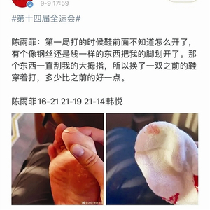 赛后,9日17时,@BWF世界羽联发布了运动员陈雨菲脚受伤的消息,消息称,“陈雨菲:第一局打的时候鞋前面不知道怎么开了,有个像钢丝还是线一样的东西把我的脚划开了。那个东西一直刮我的大拇指,所以换了一双鞋,多少比之前的好一点”。该微博配有一张大脚趾上有伤口的照片。