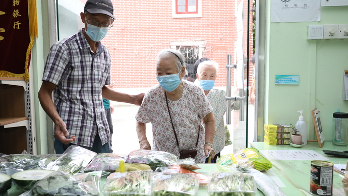 两个老人走到菜案前讨论拿什么,一个对一个说,拿这包土豆,够吃两天,不是蛮好嘛。另一个想了想,也对,吃不完还可以两人分一分。说着高高兴兴走出去了。