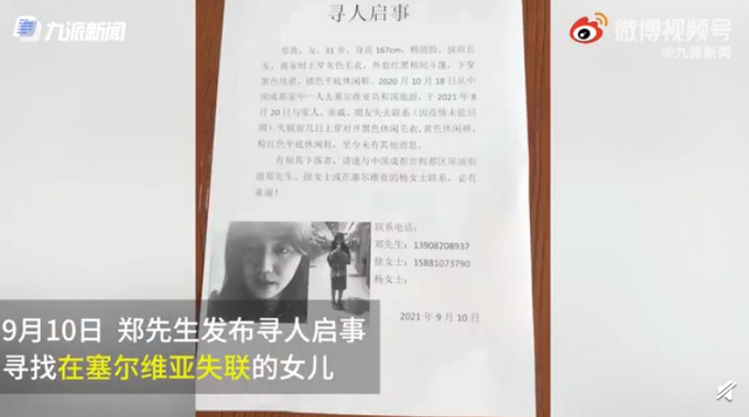 9月10日,郑先生发布寻人启事,寻找在塞尔维亚失联的女儿。据了解,2020月10月18日郑先生女儿从成都家中一人去塞尔维亚旅游,期间因疫情未能回国,于2021年8月20日与家人、亲戚、朋友失去联系,至今没有消息。郑先生说,女儿失联以后,一家人都寝食难安,他都“病在床上了”。