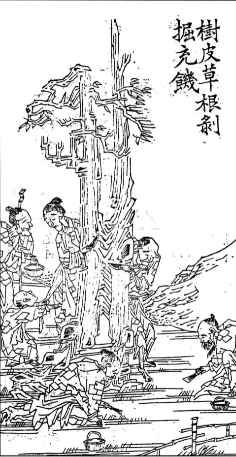 描绘光绪年间丁戊奇荒中饥民场景《树皮草根剥掘充饥》,出自《铁泪图》:“岸头挑尽无名草,树上磨光未死皮。日食万钱者,盍分一杯羹?”