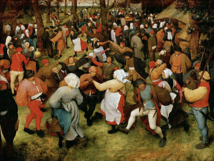 16世纪尼德兰画家老彼得·勃鲁盖尔绘制的《农民之舞》,表面上看起来农民们载歌载舞,一派欢声笑语,但背后却隐藏着一个悲伤的原因:农民们跳舞并非因为欢乐,而是因为食物中毒导致的精神错乱。为了充饥,他们不得不将能找到的一切粮食甚至是草籽做成面包,其中包括发霉长出麦角的黑麦,这些麦角中含有的麦角酸,是强烈的致幻剂,会让人头晕目眩,神经失常,跳舞不止,有些人甚至在饥饿与舞蹈中倒地身亡。