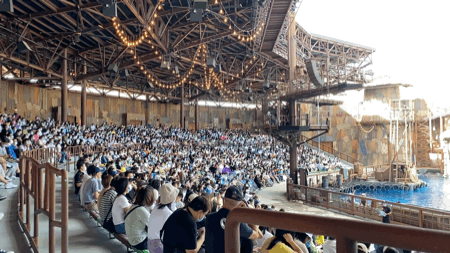 这个演出在园区多个显著位置会预告下一场演出时间,一般上午看演出的人不多,临近时间到也可以顺利进场,到了下午,可能大家都玩累了,去的人很多,记者当时想看下午3点场,提前半小时都没有位置了,大家一定把握时间哦。