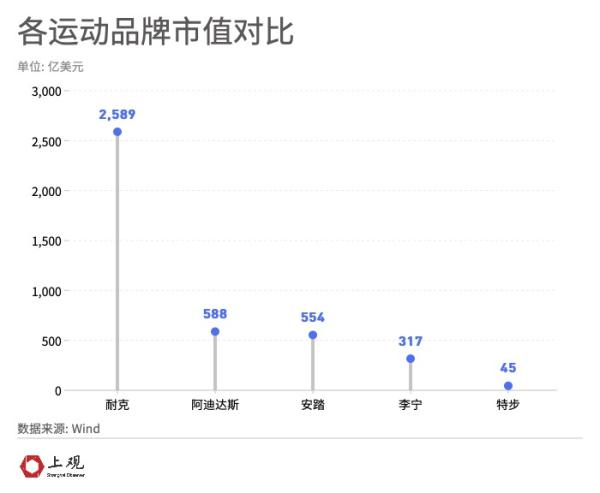 目前,安踏体育的市值达554亿美元,虽紧逼阿迪达斯,但作为运动品牌龙头的耐克市值遥遥领先,将一众运动品牌远远甩开。