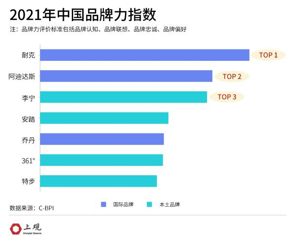品牌评级与品牌顾问机构chnbrand发布的2021中国品牌力指数榜单中,耐克、阿迪达斯,李宁及安踏位列前四。其中,耐克更是创下该榜单自2011年发布以来的历史最高得分。国产品牌中,唯有李宁长期稳定在前五名。这说明,在品牌认知、品牌联想、品牌忠诚等方面,国产运动品牌的表现整体上缺乏像耐克和阿迪达斯一样的稳定性。