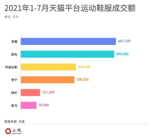 数据显示,一至七月份,安踏在天猫平台运动鞋服的成交额达60.11亿元,首次超越耐克,位列首位。此外,上半年安踏的电商收入也保持高速增长,同比增幅61%,目前线上业务占比为27%,oto(线上到线下)流水增长超170%。