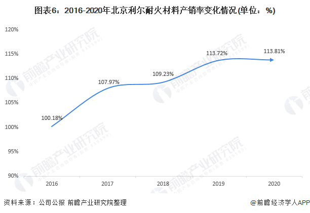 从产销率上看,北京利尔耐火材料产销率较高且近年来呈逐年上升的变化趋势。2020年,北京利尔耐火材料产销率达113.81%。