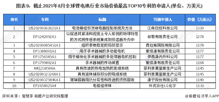 全球锂电池市场价值最高TOP10专利中,江森自控科技公司的专利价值最高,为1310万美元,此外,爱惜康有限责任公司和菲利普莫里斯生产公司占据了TOP10专利中的各两席。