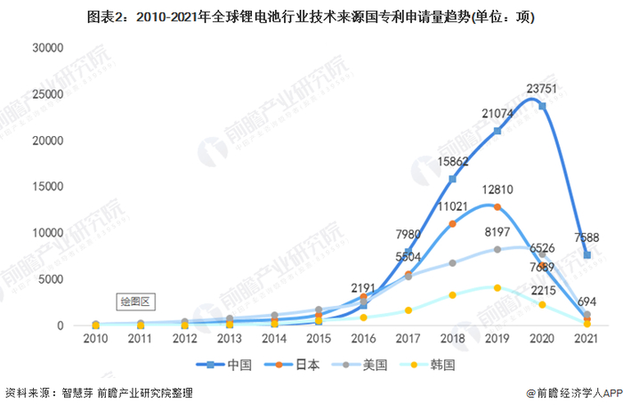 从趋势上看,2010-2019年,中国锂电池专利申请数量遥遥领先,日本、美国分别为第二第三,但在2020年后日本被美国反超。2020年,中国锂电池专利申请量为23751项。