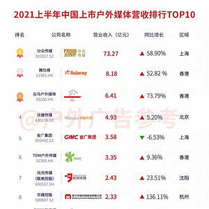 2021年上市户外媒体半年报TOP10榜单出炉!