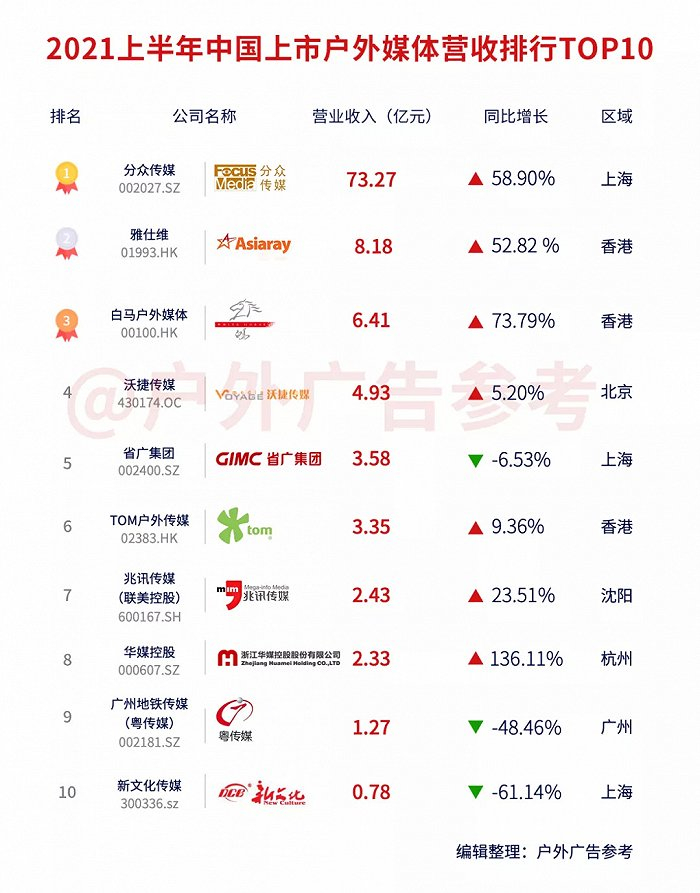原标题:2021年上市户外媒体半年报TOP10榜单出炉!