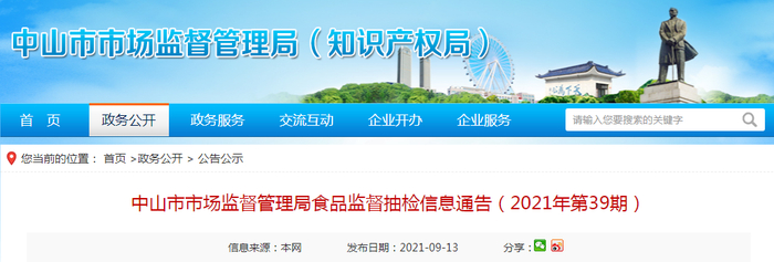 中国质量新闻网讯 2021年9月13日,广东省中山市市场监督管理局网站发布食品监督抽检信息通告(2021年第39期)。