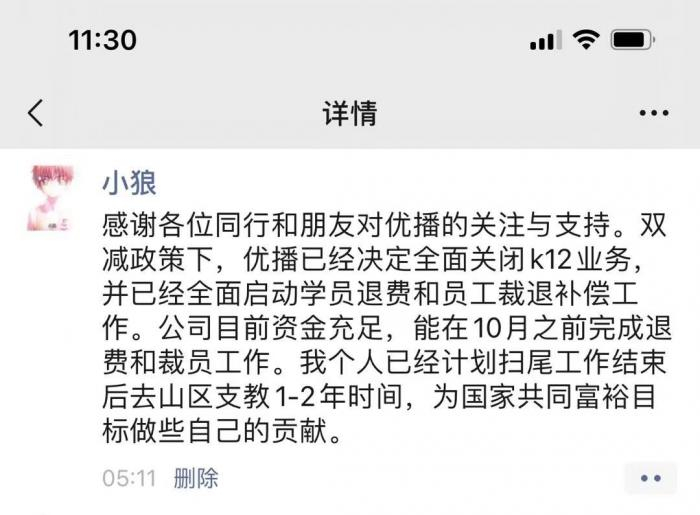 朱宇在朋友圈中称,“双减政策下,优播已经决定全面关闭K12业务,并已经全面启动学员退费和员工裁退补偿工作。公司目前资金充足,能在10月之前完成退费和裁员工作。”