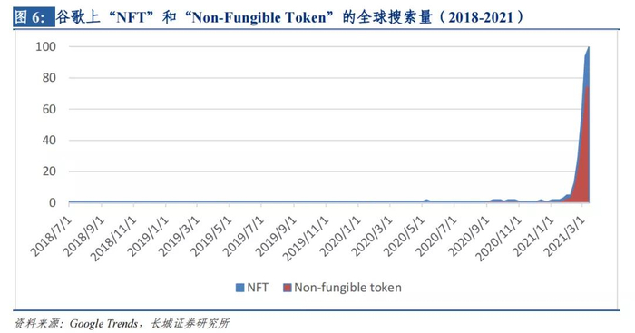 数据显示,NFT搜索量在2021年呈爆发式增长。在Google Trends上,关键词“NFT“和“Non-Fungible Token”全球的搜索量剧增,这意味着NFT生态系统的热度和可见度在不断攀升。