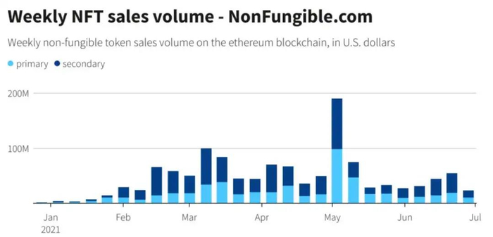 2021年NFT 周交易量变化 数据来自NonFungible