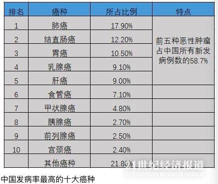 在发病谱上,中国最常见癌种依次为肺癌(约占中国癌症新发病例总数的17.9%)、结直肠癌、胃癌、乳腺癌、肝癌、食管癌、甲状腺癌、胰腺癌、前列腺癌、宫颈癌。
