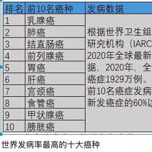 从发病率角度来看,前10名癌症分别为乳腺癌、肺癌、结直肠癌、前列腺癌、胃癌、肝癌、宫颈癌、食管癌、甲状腺癌、膀胱癌,发病例数占全部新发癌症的60%以上,女性乳腺癌首次超过肺癌成为最常见的癌症——2020年新发乳腺癌226万例,占总体癌症发病的11.7%,其次是肺癌。
