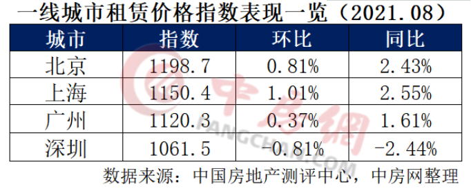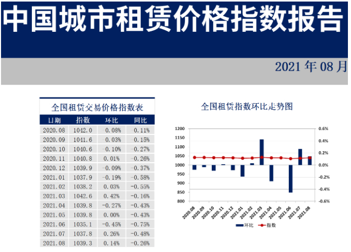 中房网讯 (刘敬/文)近日,由易居企业集团、上海易居房地产研究院中国房地产测评中心、华东师范大学东方房地产研究院三方共同发布的《中国城市住房租赁价格指数报告》显示,2021年8月份中国城市租赁价格指数为1039.3点,环比上涨0.14%,同比跌幅0.26%。