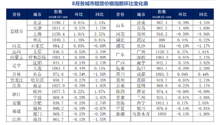 其监控的35个城市中,有9个城市(重庆、上海、北京、武汉、广州、杭州、西宁、成都、石家庄)租赁价格指数环比上涨,上涨城市数量与上个月相同。其中,重庆、上海和北京位居涨幅榜前三,涨幅分别为1.40%、1.01%和0.81%。