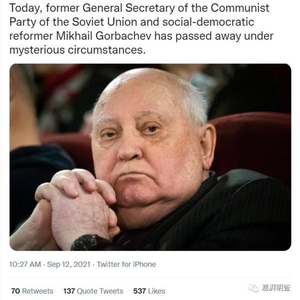 近日,一个名为“路透社”的推特账号发文称,前苏联领导人戈尔巴乔夫在家中神秘去世,这则消息很快在推特和中文网络上引起了不小的轰动。