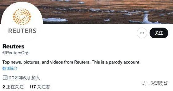 上述“路透社”账号简介显示,虽然冒用路透社的头像和名称,但该账号并没有经过认证,实际上是一个“戏谑账号”(parody account),且注册于今年6月,目前一共发布过11条推文,拥有一百多关注者。