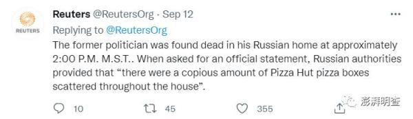 9月12日,假“路透社”还煞有其事地在推文下回复称:“美国山地时间下午两点,这位前苏联领导人被发现死于俄罗斯的家中,在他房子里发现了许多必胜客的比萨盒。”评论区有不少人表示“差点就相信了”、“这已经是他第三次去世了”,也有推特用户指出:“除了必胜客,这则假消息看起来挺像那么回事。”