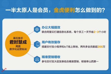 对金虎来说,过去一直苦于吸引顾客,有时候攒足了劲做促销,周边居民都不知道。如何吸引客流、留存、提升客单价?打造数字会员体系,把生意做到线上,是金虎给出的一项解决方案。