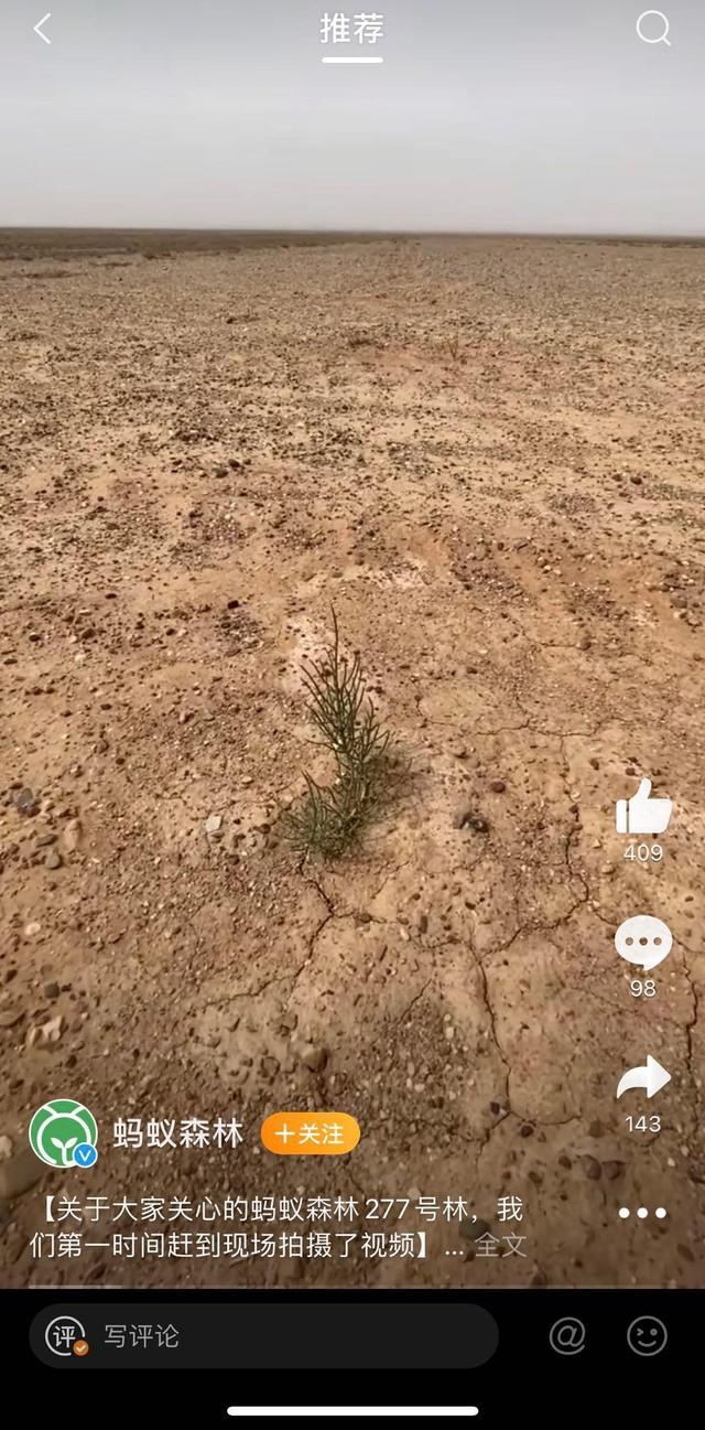 近日,有网友在微博发文称,通过蚂蚁森林攒能量种树,实际地方却看不到树。该网友发布的视频显示,在有支付宝蚂蚁森林标识的地面上,没有明显种树的痕迹。据该网友发布的视频显示,标志牌指向的种植区,系位于阿拉善左旗的蚂蚁森林277号林。