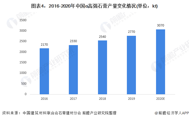 近几年,国内企业积极投入利用工业副产石膏生产高强石膏的研发,特别是采用水热法制备高强石膏的研究取得了较好的进展,所用的副产石膏包括氯碱石膏、磷石膏、脱硫石膏等,高强石膏产量不断增长,2018年约为2540kt,初步测算2020年突破3000kt。