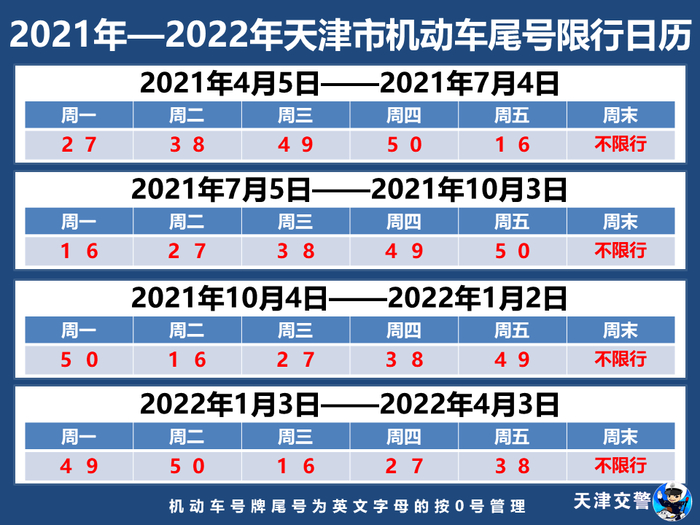 记者从公安交管部门了解到,按照天津市机动车限行交通管理措施规定,中秋节假期,本市及外埠号牌机动车和使用小客车区域指标登记上牌的本市机动车不受“尾号限行及早晚高峰限行”规定的限制,可正常上路行驶,但货运机动车仍需遵守相关限行规定。为便于广大市民掌握尾号限行规则,公安交管部门提示如下: