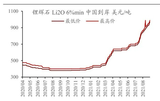 上周,锂辉石精矿价格冲过2018年1月的历史最高点(约960美元/吨),突破1000美元/吨大关。
