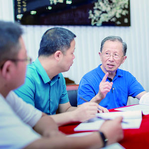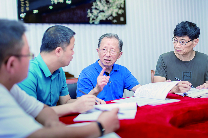 二○二一年九月十日,参加完教师节庆祝活动后,任祖镛(右二)和中青年教师在讨论问题。