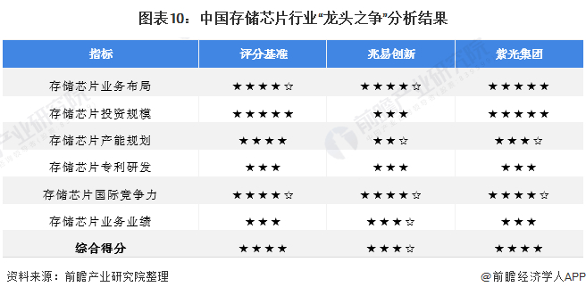 存储芯片行业属于技术、资金双密集产业,产品设计周期长、工艺复杂、资金投入高,对企业研发能力、技术经验积累、资金实力均有较高的要求。因此,技术升级和投资是公司间竞争的主要策略。此外,存储芯片市场份额和业绩能反应公司产品的市场销售状况。基于前文分析结果,前瞻认为,紫光集团因在业务布局、投资规模等方面占有优势,目前为我国存储芯片行业“领头羊”。