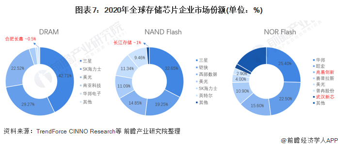 2020年,三星、SK海力士、美光垄断了全球约95%的DRAM市场,合肥长鑫市占率约为0.5%;截至2020年末长江存储取得全球接近1%市场份额,成为六大国际原厂以外市场份额最大的NAND晶圆原厂;根据CINNO Research数据,兆易创新2020年在全球NOR Flash市场中市占率达到15.6%,排名第三,仅次于华邦和旺宏,武汉新芯NOR Flash市场份额达2.2%。