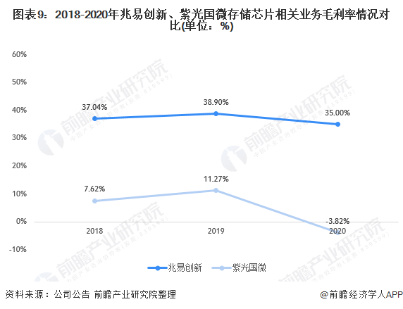 从毛利率来看,2018-2020年,兆易创新存储芯片业务毛利率均在35%以上,2020年为35%;2018、2019年紫光国微存储芯片业务毛利率分别为7.62%、11.27%,整体低于兆易创新;2020年转让西安紫光国芯后,公司存储芯片毛利率为负。
