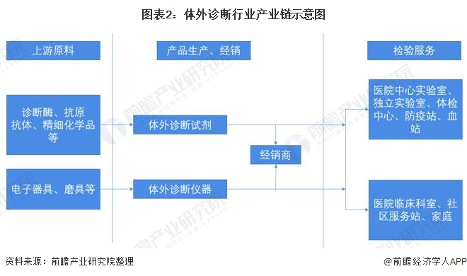 体外诊断行业上游主要包括电子器件、磨具、诊断酶、抗原、抗体、精细化学品等;下游应用市场主要包括医院中心实验室、独立实验室、体检中心、防疫站、血站等。