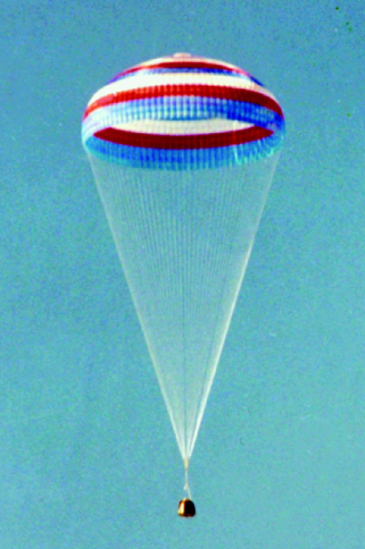 第四阶段是回收着陆阶段。在距地面约10千米时回收着陆系统开始工作。它先打开伞舱盖,然后依次拉开引导伞、减速伞、牵顶伞和主降落伞。其中减速伞可把返回舱的速度从200米/秒减至60~70米/秒,主降落伞可把返回舱的速度由70米/秒减至5~6米/秒。另外,返回舱降到一定高度(距地面约5.5千米)还要抛掉返回舱的防热大底,以便露出返回舱底部的反推发动机。在距地面1米左右时,4台反推发动机点火,使返回舱以大约3米/秒的速度软着陆,从而保证航天员着陆时的安全。