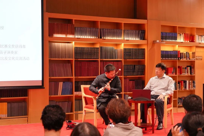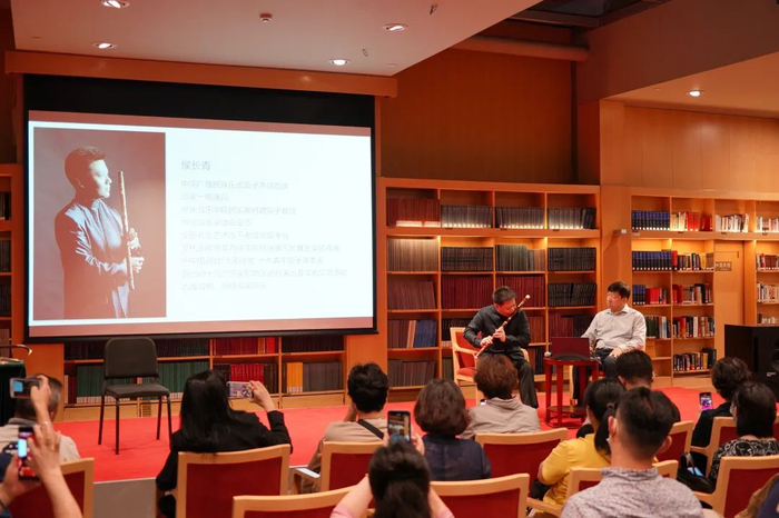 笛箫演奏家侯长青在现场示范笛子的吹奏方法,新笛有韵味声音近似长笛;曲笛《鹧鸪飞》有笛膜,声音明亮,意象氛围;梆笛演奏《五梆子》具有北方笛子的特点,声音清脆坦率, 引得掌声阵阵。