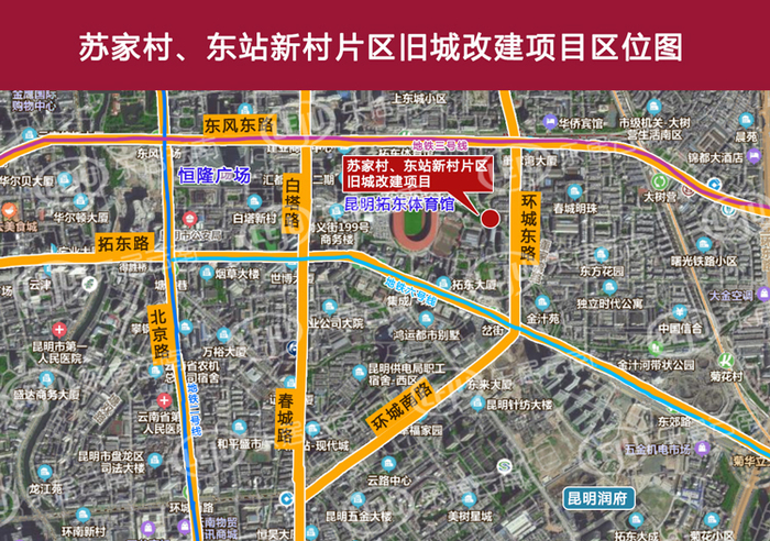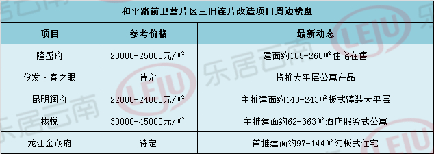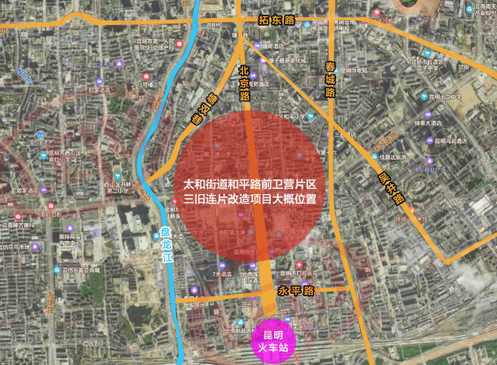 从区位,和平路前卫营片区三旧连片改造项目地处昆明一环,地铁2号线、北京路、环城南路、春城路、二环南路等城市主干道穿插,周围分布有东风广场商圈、大悦城商圈及昆明火车站等,配套成熟,附近开发有隆盛府、俊发·春之眼、昆明润府、拢悦、龙江金茂府等项目。