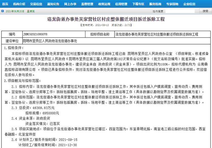 此外,呈贡雨花社区将进行整体搬迁,项目共涉及460户,人口约1400人,拆迁总面积约84000㎡,搬迁安置总金额概算为4.1亿元,计划开工时间为今年10月10日,工期为200个日历天。
