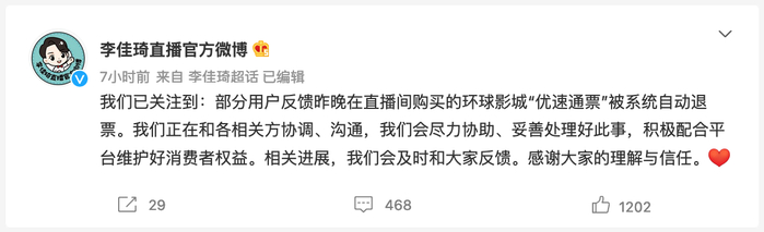 此外,李佳琦带货的北京环球影城门票也出现了同样问题。9月14日上午,李佳琦直播官方微博表示,已关注到部分用户反馈昨晚在直播间购买的环球影城“优速通票”被系统自动退票。李佳琦直播正在和各相关方协调、沟通,我们会尽力协助、妥善处理好此事,积极配合平台维护好消费者权益。