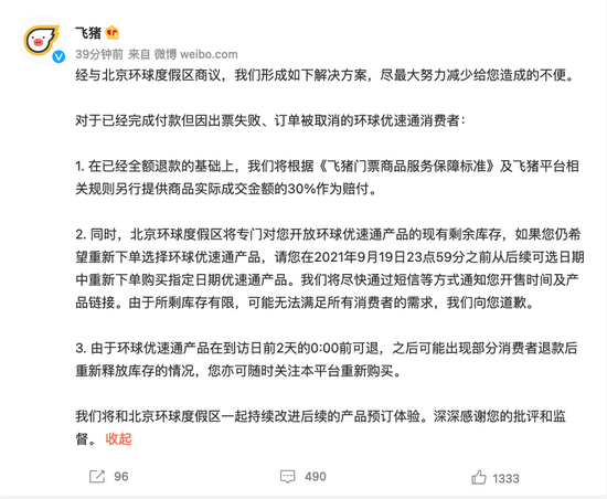 原标题:飞猪公布“环球优速通出票失败”解决方案:退款+赔付30%