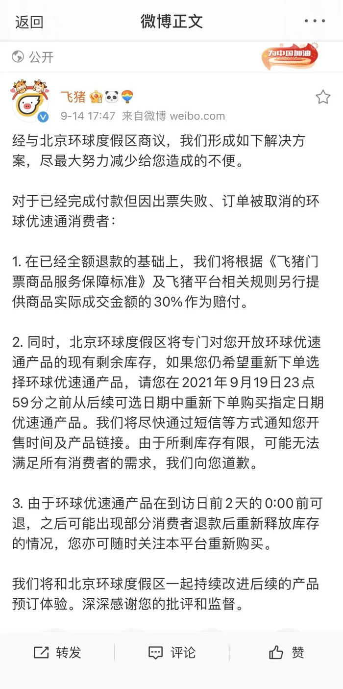 9月14日17时47分,飞猪在其官方微博公布与北京环球度假区的解决方案:对于已经完成付款但因出票失败、订单被取消的环球优速通消费者,在已经全额退款的基础上,根据《《飞猪门票商品服务保障标准》及飞猪平台相关规则另行提供商品实际成交金额的30%作为赔付。