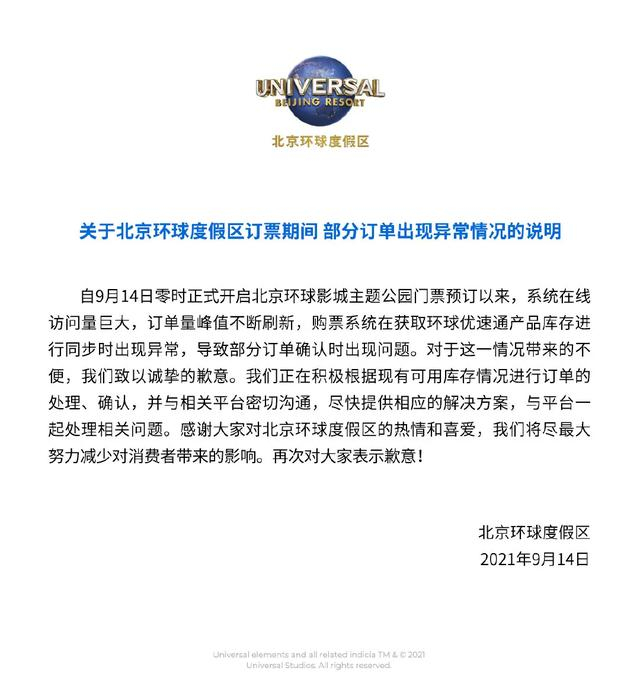 北京环球度假区致歉