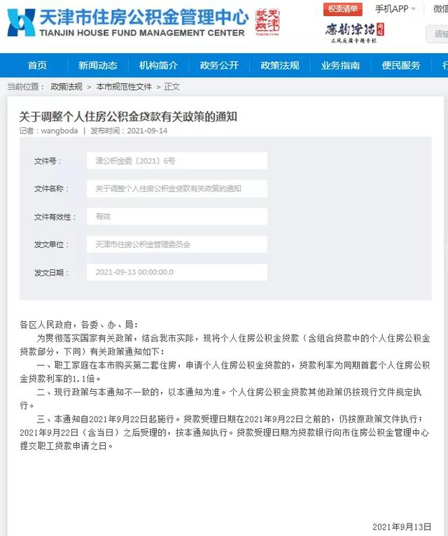 14日,天津公积金管理中心发布《关于调整个人住房公积金贷款有关政策的通知》,将个人公积金贷款在津购买二套住房利率调整为同期首套利率的1.1倍,本通知自2021年9月22日起施行。