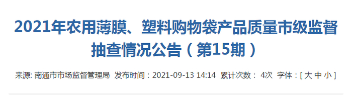 江苏南通市市场监管局发布2021年农用薄膜、塑料购物袋产品质量市级监督抽查情况(第15期)