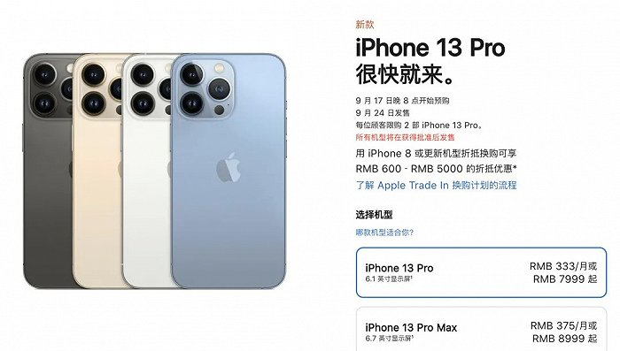 国内定价,iPhone 13 mini售价5199人民币起,iPhone 13售价5999人民币起,iPhone13 Pro售价7999人民币起。与iPhone 12系列相比,iPhone 13 mini和iPhone 13最低配降价300,但容量从64G升到了128G,同等存储容量下最多降价800元;Pro系列最低配也直降500和300元。