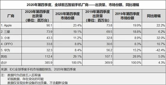 2021年初,IDC公布的全球智能手机份额显示,苹果第四季度出货量飙升了22%,占据了全球智能手机市场23.4%的份额。这让苹果“咸鱼翻身”,市占率从第三季度的第四,跃升至榜首。无疑,这样的成绩和iPhone12系列息息相关。
