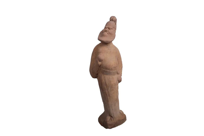 泥质红陶,陶俑高鼻深目,络腮胡须,为胡人形象,头戴幞头帽,双目斜向上视,身着圆领长袍,腰系宽带,左手下垂,右手握拳于胸。