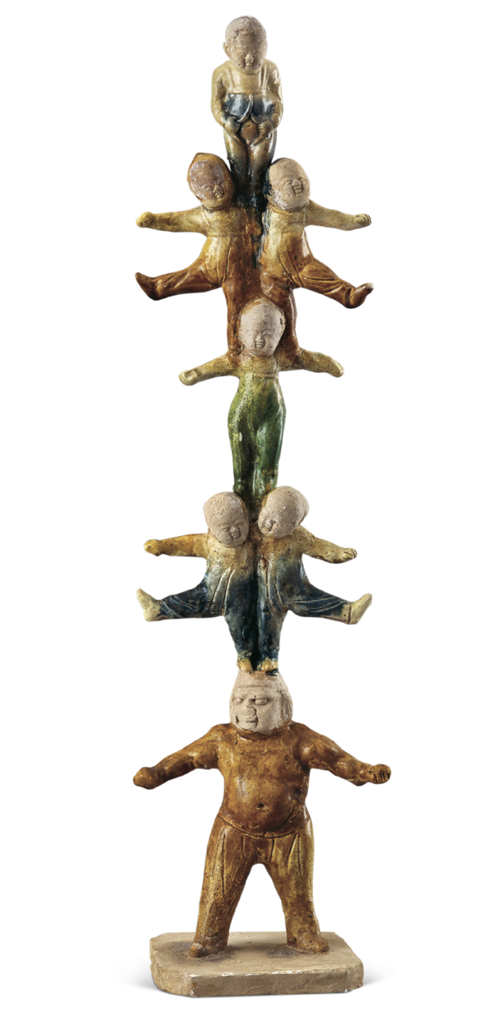 三彩童子叠置技俑,唐,通高 40.8 厘米,2002 年西安市长安区郭杜镇唐墓出土,西安博物院藏