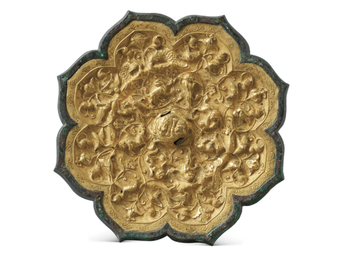 八出菱花形,镜背贴一金壳,瑞兽葡萄镜是唐代最具特色的新镜类,将中国传统的瑞兽纹饰与从西方传入的葡萄纹巧妙地结合在一起。此面金壳镜胎体厚重,金壳质细光亮,制作精致,殊为罕见珍贵。